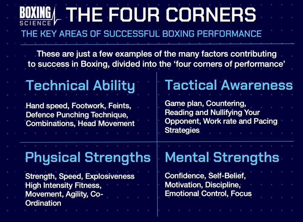 - There are four ‘corners’ to boxing performance – Technical, Tactical, Psychological and Physical