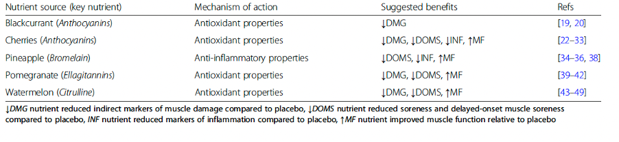 There is an abundance of studies investigating the effects of different types of fruit and vegetables on aspects of recovery from exercise. Fruit and vegetable derivatives have beneficial effects due to their high polyphenol content, scavenging reactive oxygen species and reducing inflammation. However, we now think that their beneficial effects may not be due to reducing inflammation but to improve blood flow so that key nutrients are delivered to help the repair of muscle tissue.