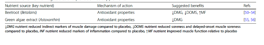 Observational studies from Mediterranean countries have suggested that a Mediterranean diet is equivalent to consuming 1000 mg of polyphenols daily. This implies that consuming a diet rich in fresh fruits and vegetables may have benefits for recovery (Zamora-Ros et al. 2016). Other kinds of fruits and vegetables have also been reported to aid recovery, including but not limited to blueberries, elderberries, pineapple, watermelon, blackcurrant, pomegranate and beetroot (See table 2 below) (Mcleay et al. 2012; Clifford et al. 2016; Ammar et al. 2016).