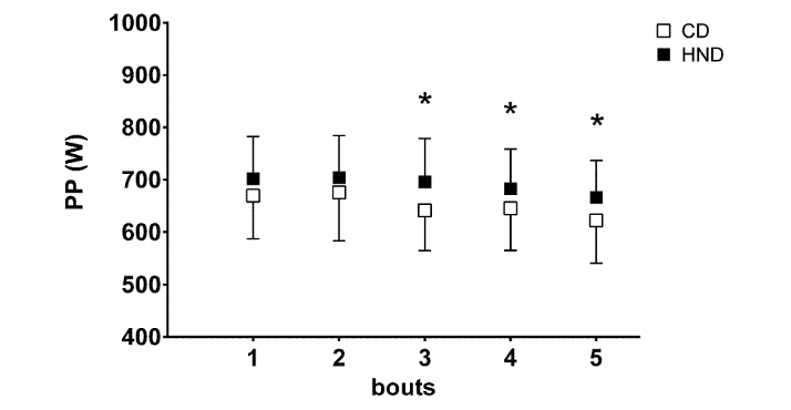 Beetroot juice is a common supplement that has been known to improve aspects of performance, including aerobic and anaerobic endurance (Jones et al. 2014). Studies suggest that consuming 500 mg of dietary nitrates, which is the equivalent of 200 to 400 g of fresh beetroot, 150 minutes before exercise will have performance benefits, especially in the untrained (Murphy et al. 2014). A recent study by Porcelli et al. (2016) investigated the effects of a high nitrate diet on performance measures, including peak power during a repeated Wingate test. The high-nitrate diet outperformed the control diet providing evidence that consuming a high-nitrate diet potentially improves oxygen delivery (see table 3 and figure 3 below).