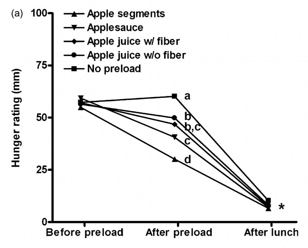 Figure 1. Hunger ratings following the consumption of apples, apple sauce and apple juice (Flood-Obbagy 2009).