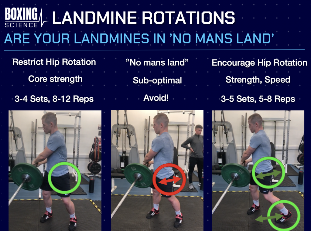 The landmine rotation is an effective exercise which can develop core strength and the way the core utilises the stretch shortening cycle. This exercise develops strength through resisting rotation and lateral flexion (side bending) of the spine. Strength, stability and speed in these movements are crucial in punching hard.