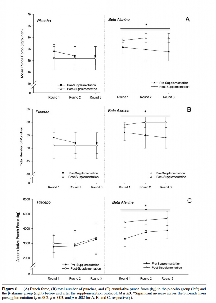 Donavan et al. (2012) investigated the effects of (4 x 1.5 g) beta-alanine supplementation taken for 4 weeks on punch force and frequency in 16 amateur boxers. Beta-alanine supplementation increased post lactate accumulation (post supplementation 12.6mmol/L, pre supplementation 9.5 mmol/L) compared to the placebo group (post supplementation 7.0 mmol/L, pre supplementation 8.0 mmol/L). In addition, beta-alanine supplementation also increased punch force and the total number of punches thrown during 3 x 3-minute rounds with 10 seconds of all-out punching at the end of each round. This provides evidence that beta-alanine supplementation can improve boxing specific punch output.