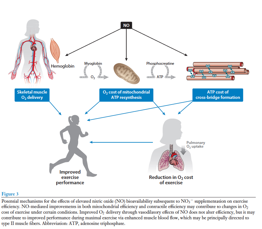 Dietary nitrates improve physical performances by reducing oxygen cost of exercise. ATP turnover rates from phosphocreatine hydrolysis and oxidative phosphorylation are lower following dietary nitrate supplementation, resulting in a significant reduction in the estimated total ATP turnover rate during submaximal and high-intensity exercise (Jones et al. 2018).