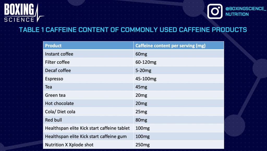 Most of the research shows that the ideal caffeine dosage for performance improvements should be 3-6mg\kg (Grgic et al. 2020). This would equate to 180mg of caffeine for a 60 kg individual. Please see table 1 below for estimated caffeine content per serving of popular caffeine products.