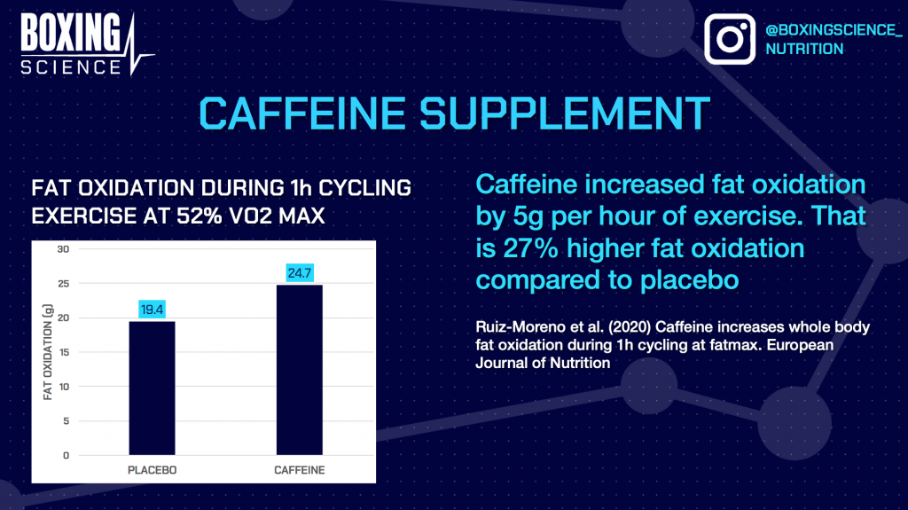 Ruis-Moreno and colleagues (2020) found that participants who ingested 3mg/kg of caffeine before a 1-hour cycling session at fat max (52% VO2max) increased fat oxidation by 27% compared to the placebo. Acute ingestion of caffeine gum can also improve high-intensity performance such as repeated sprints, Yo-Yo intermittent recovery test and countermovement jump height (Ranchordas et al. 2019). Due to boxing being a high-intensity intermittent sport that requires high levels of aerobic endurance as well as reaction time caffeine supplementation will aid boxing performance.