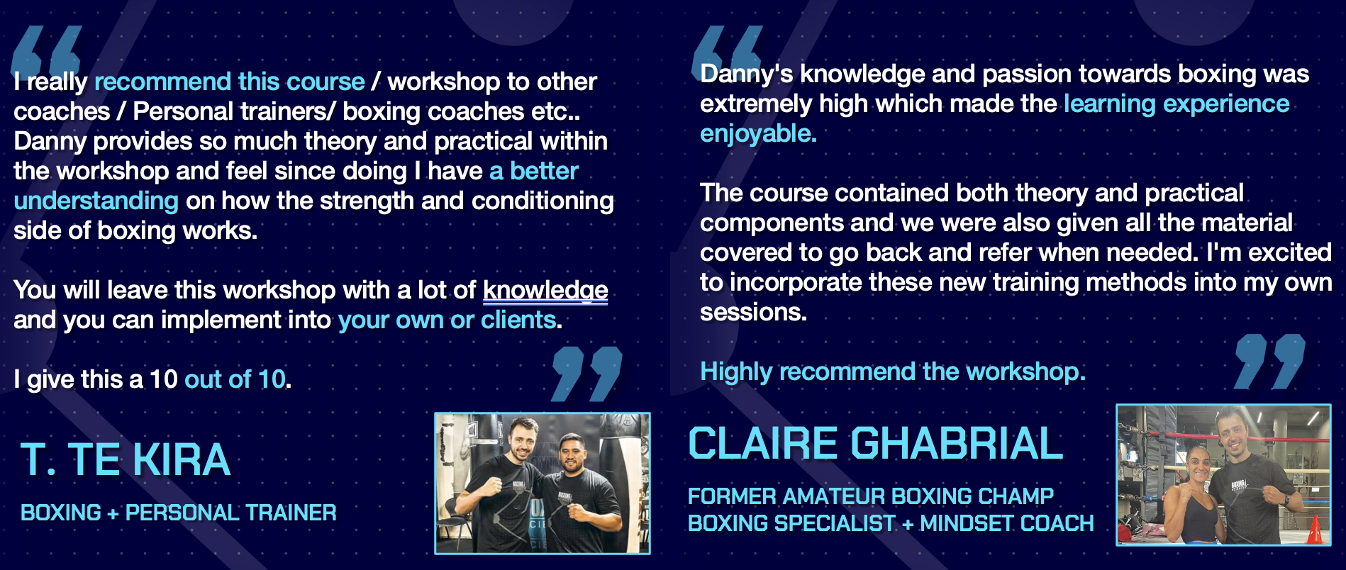 If you’re a coach, personal trainer or an athlete, these workshops are perfect to help you level up your knowledge and acquire the tools to implement strength and conditioning for Boxing and Combat Sports.