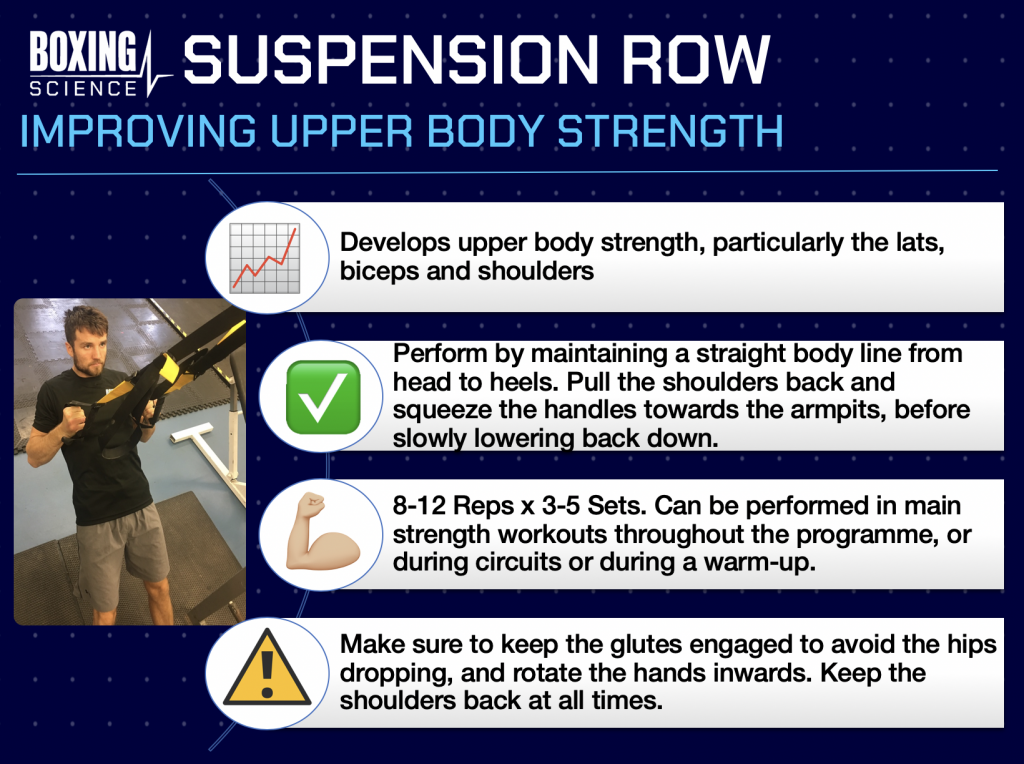 The suspension row is the one of our foundational upper body exercises for boxers. It can be performed in strength sessions, and as part of a circuit, due to a number of key benefits.