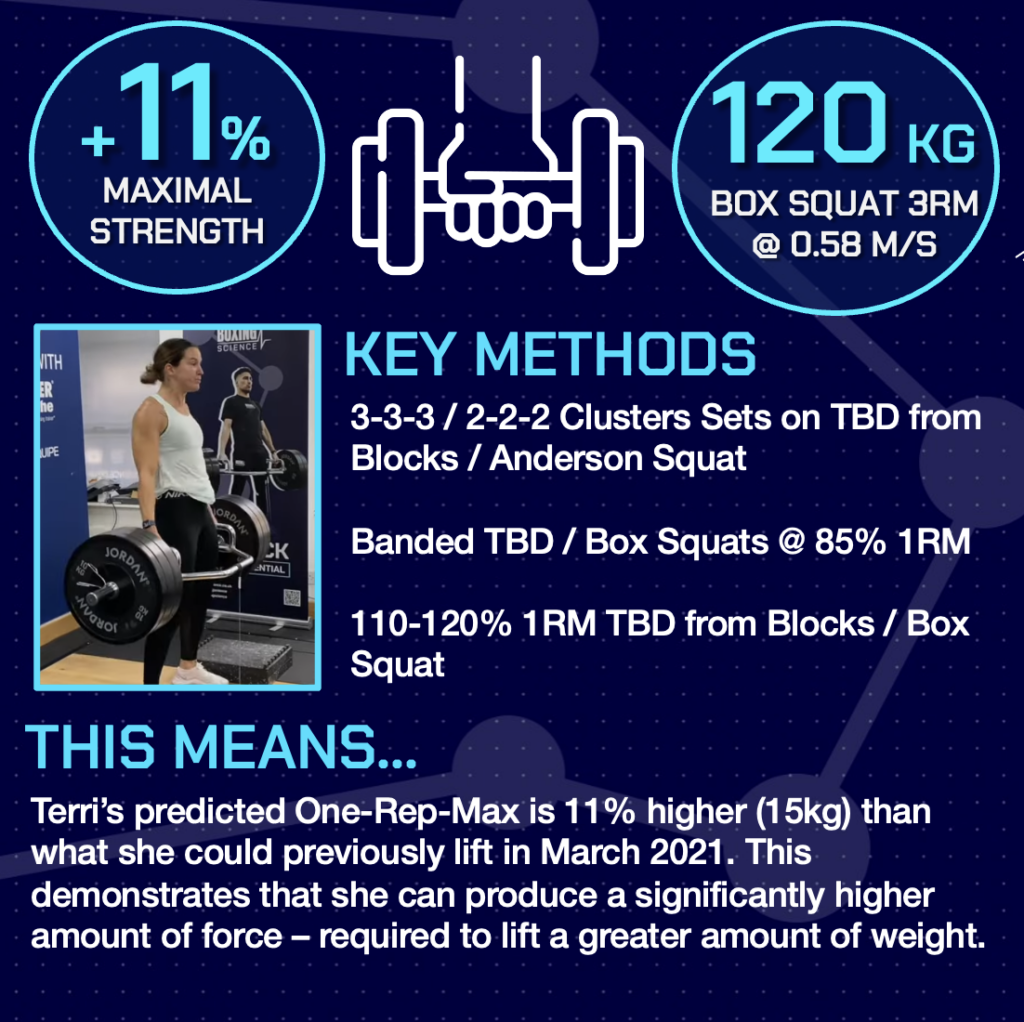 This transitioned to Banded TBD and Banded Box Squats to develop acceleration, before maxing out on TBD from blocks / Box Squats for 3 reps x 3-4 sets. This resulted in Terri performing a very impressive 120 kg Box Squat for 3 reps.
