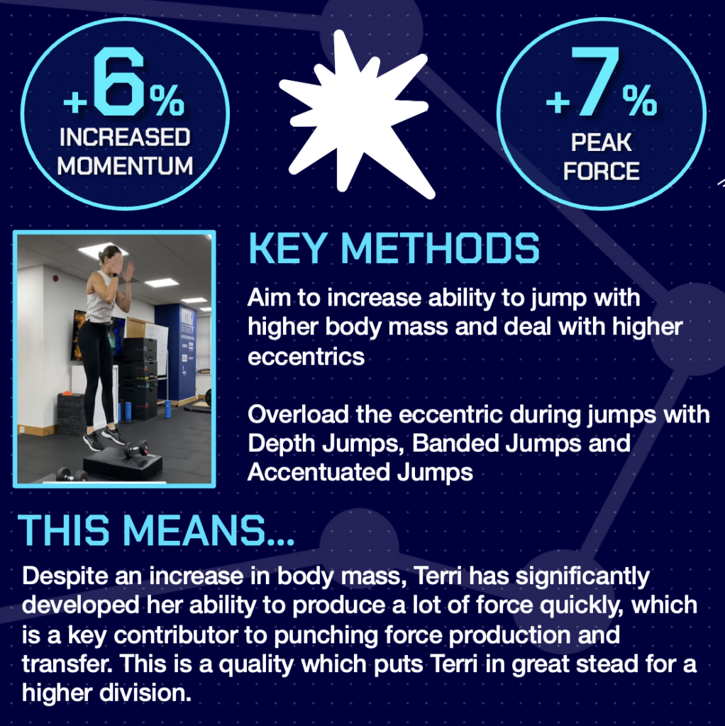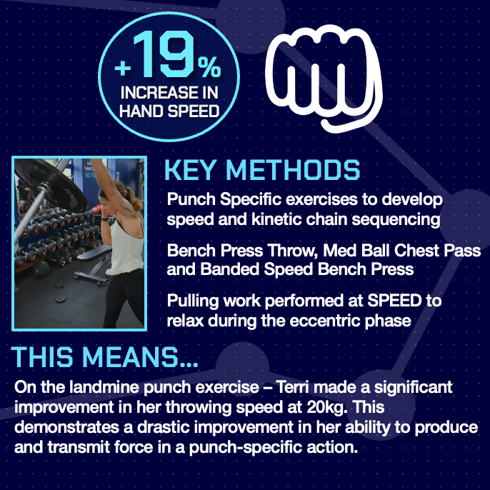 Terri started working with Boxing Science in September 2020 following her draw with Natasha Jonas. She was a fast responder, with big gains in strength, speed and high-intensity fitness ahead of her impressive Round 9 TKO win against Kathirina Thanderz.