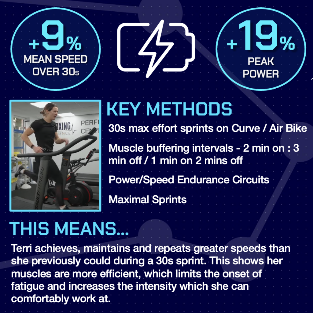 This was divided into two phases, speed and power-endurance. This challenged Terri’s ability to repeatedly perform high-intensities and high-force actions under fatigue.