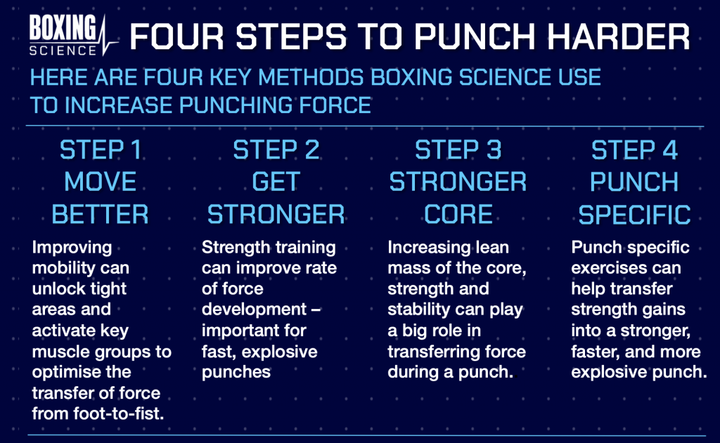 Scientific research into the punch has highlighted a two dimensional training approach to improve punch force that should involve maximising acceleration from foot to fist as well as effective mass.