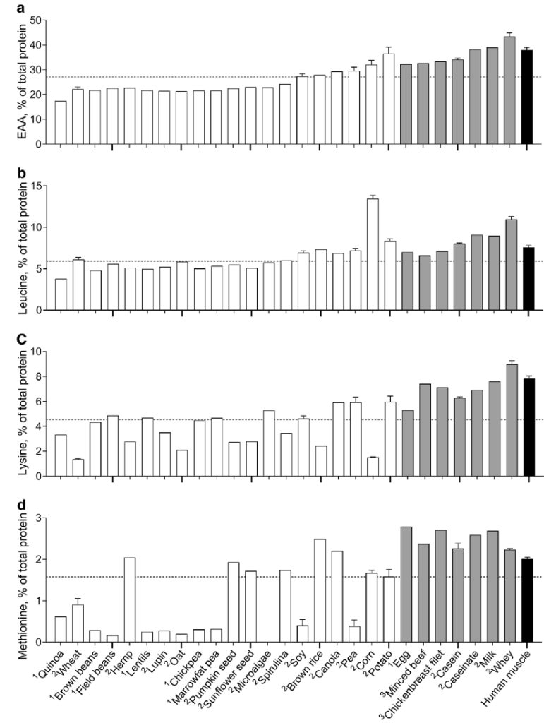 Figure 1 below shows the % of essential amino acids, leucine, lysine, and methionine contents of various dietary proteins, including plant-based and animal-derived proteins. We recommend combining the plant-based proteins with the highest bars in each of the leucine, lysine and methionine amino acids should promote a greater effect on muscle protein synthesis.