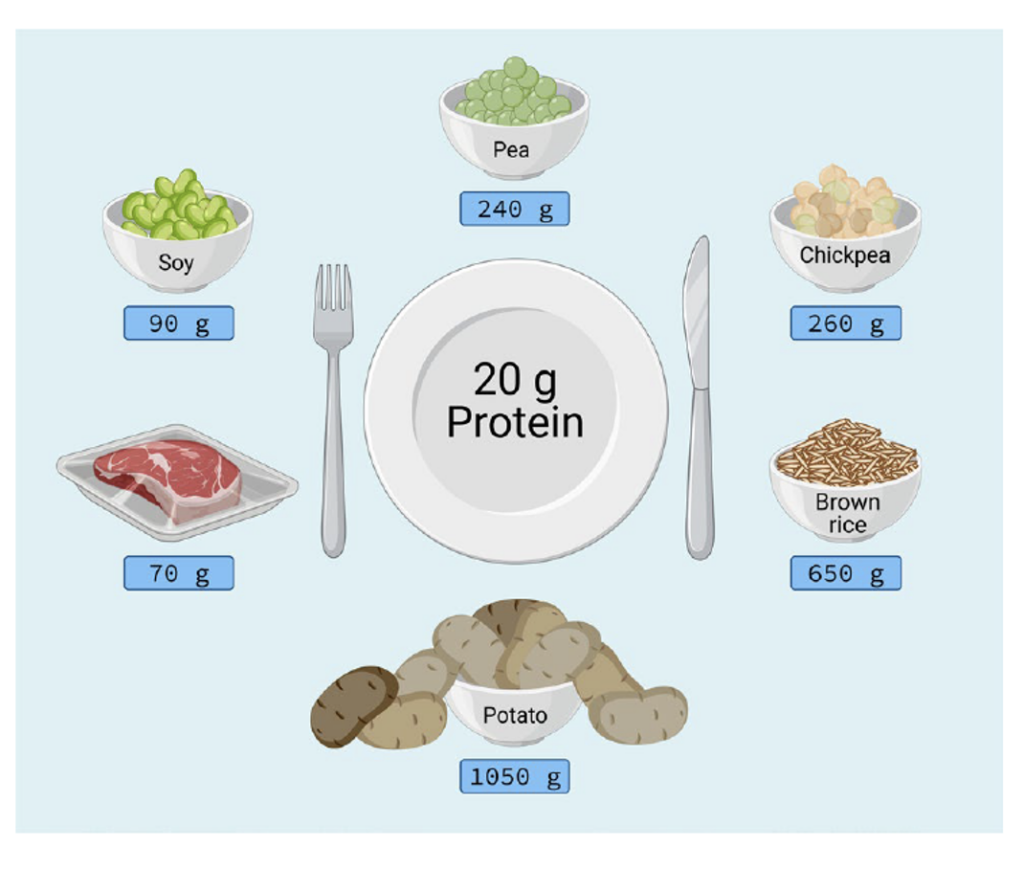Figure 2. Food quantity needed to be consumed to reach 20g of protein from a variety of plant-based protein sources compared to an animal protein (Pinckaers et al. 2021).