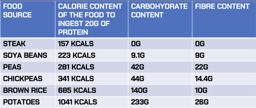 Recently, it has been revealed that when a plant-based protein (60 g of wheat protein) is increased to match the essential amino acid content of an animal protein (30 g of milk protein) there is no difference in the muscle protein synthesis response between both plant-based and animal-derived protein (Pinckaers et al. 2021). While such as strategy would be easy to apply when considering the use of plant-based proteins, it may not always be practical. The lower protein density of plant-based protein sources would increase and even double the total caloric and volume content of the plant-based food that would need to be consumed. See figure 2 and table 2 below for examples of the amount and energy content of whole food needed to be consumed to ingest 20 g of protein from plants compared to steak.